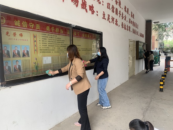 院內整理清掃完畢后,大家又轉移陣地到辦公樓內,對辦公室、廁所、樓道等區域進行了打掃。黨員們充分發揚“甩開膀子、挑起擔子”的精神,擦拭玻璃、打掃地面、清理垃圾,全方位消毒噴殺,每一步都認真到位,不留死角。經過近三個小時的辛勤勞動,院里綠化帶的枯枝、雜草得到了整治,機關大院內更加整潔美觀,環境煥然一新。機關辦公室窗明幾凈、一塵不染,所有衛生死角被徹底清理。大家擦擦汗水,露出會心的微笑。