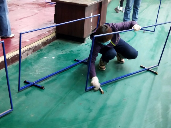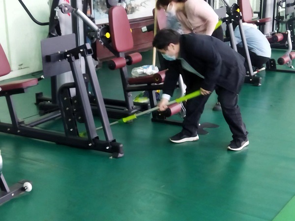 參與活動的20余名同志,分工合作,雖然大家來自不同部門、不同崗位,但爭先恐后、合作默契,清理地面、擦拭健身器材、清潔桌凳。“前面的男同志們加油了,我們快趕上你們了!”負責拖地的九分公司主任經(jīng)濟師劉彩在后面說道。“這個乒乓球擋布拿抹布擦拭的效果不太好,用外面的高壓水槍沖洗試試吧!”九分公司主任會計師付世芳一邊用抹布擦拭擋布一邊提出自己的合理化建議,“這個辦法好!”九分公司綜合辦公室主任張路平同意道。