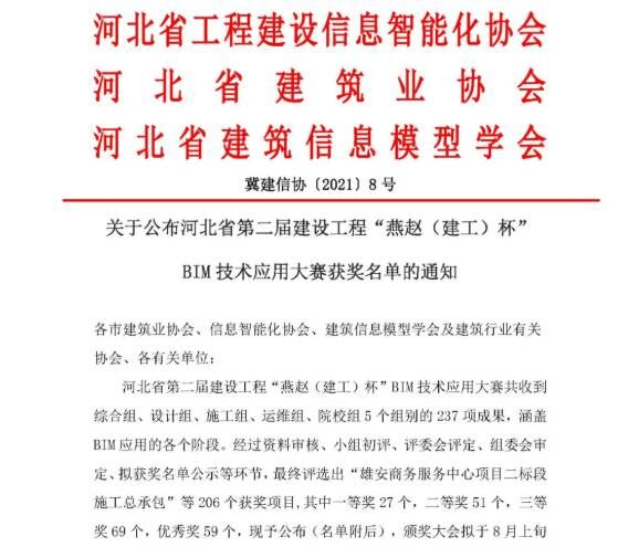 據悉,本次大賽由河北省工程建設信息智能化協會、河北省建筑業協會、河北省建筑信息模型學會共同舉辦,共收到237項參賽成果,最終評選出一等獎27個,二等獎51個,三等獎69個,優秀獎59個。此次獲獎,充分展現了公司BIM技術應用水平和實力,彰顯了企業品牌形象。(BIM中心)
