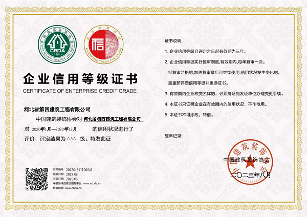 此次獲得中裝協AAA級企業信用等級證書,是中裝協對公司堅持守法經營、誠信經營的充分肯定和高度認可,是對河北四建實力和品牌形象的最好詮釋。(質量技術部)