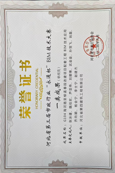 8月16日,七分公司收到了河北省市政行業協會頒發的榮譽證書。分公司參賽的“G104海河路至柳孟春段改建項目配套工程BIM技術應用”成果,在河北省第三屆市政行業“永通杯”BIM應用技能大賽中被評為一類成果。