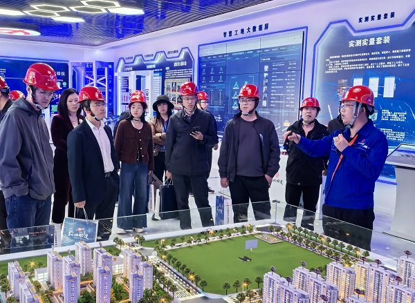 在智能建造指揮中心,項目技術總工向觀摩團介紹了公司基本情況、工程概況,重點圍繞項目智慧工地系統,講解了物聯監測、安全管理、質量管理、項目進度、360度全景等8大模塊內容。項目部設立了智慧工地管理平臺,將項目進度、質量、安全、勞務等各方面數據集中統一管理,方便了管理人員科學分析與決策;安裝了塔吊在線監測、吊鉤盲區可視化系統,保障吊裝安全,提高了作業效率;應用了揚塵噪聲在線監測、遙控器控制揚塵噴霧等智能系統,有效控制了揚塵污染……一系列實際應用及效果圖片,充分展示了項目高質量、智慧化建設水平,觀摩人員紛紛拿起手機拍照記錄。