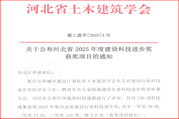 7月3日,河北省土木建筑學會公布了2025年度河北省建設科技進步獎名單。公司憑借扎實的科技創新與技術攻關能力,一舉斬獲16項科技成果獎項,其中,一等獎1項、二等獎4項、三等獎11項。