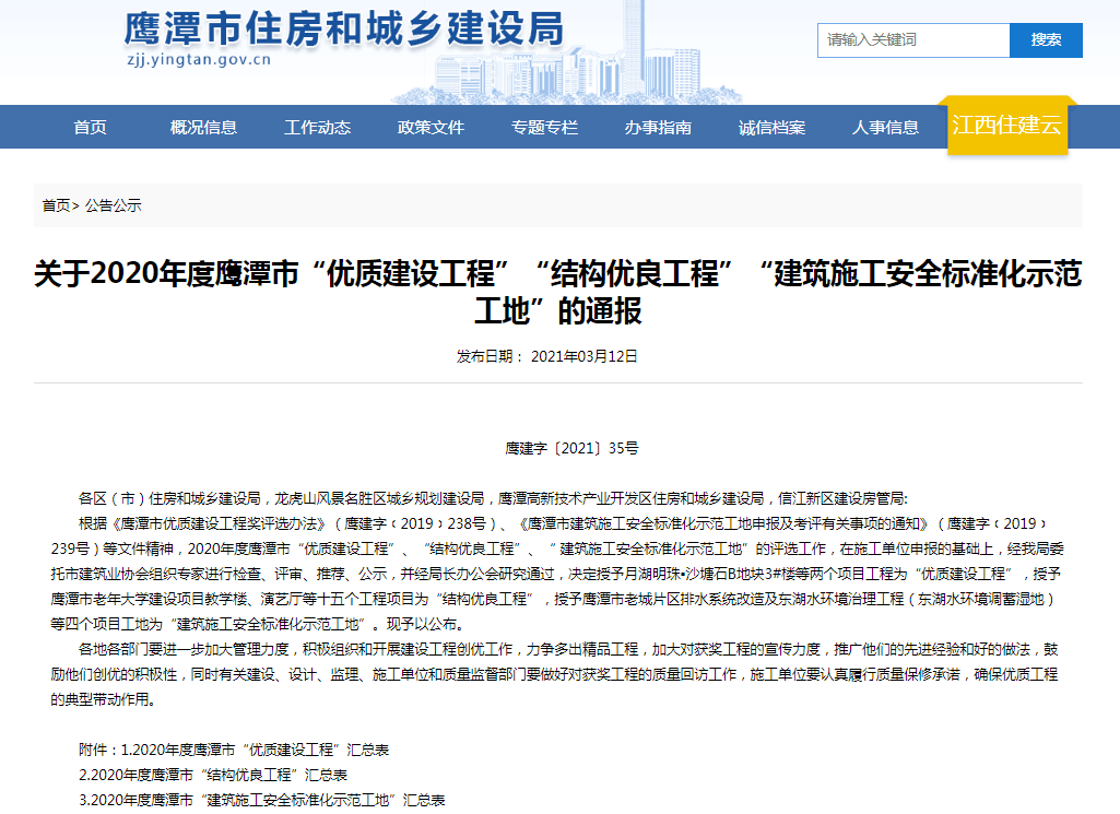 4月12日,從江西省鷹潭市住房和城鄉建設局網站獲悉,四分公司承建的鷹潭市檔案中心項目喜獲2020年度鷹潭市結構優良工程和建筑施工安全標準化示范工地兩項榮譽。
