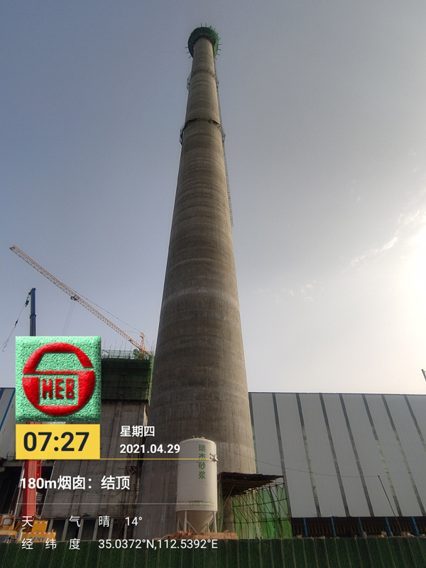 4月29日,六分公司河南金馬項目部完成了關鍵施工節點——180m煙囪土建工程順利結頂,刷新了河南省濟源市最高建(構)筑物紀錄。