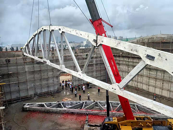 5#平房倉的倉頂由16榀預應力屋架梁和400塊屋面板構成,每榀預應力屋架梁重14.24噸,長度達30米,平房倉的工作重點是預應力屋架梁的制作及吊裝,工作難度大、技術含量高,項目部緊抓屋架梁預制這道關鍵工序,提前謀劃,做好準備。