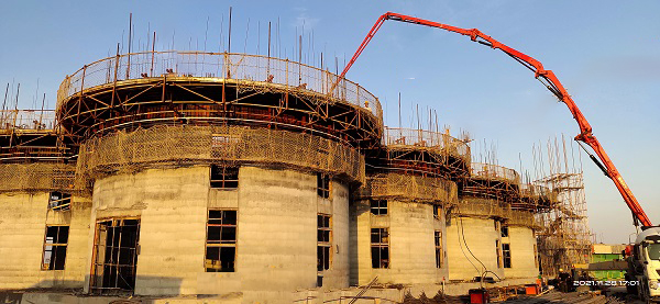 正在進行的滑模施工共有16座立筒倉和18座淺圓倉。其中淺圓倉直徑23米,立筒倉直徑12米,為聯體倉,是整個滑模施工的難點。針對這一情況,項目部細致策劃,通過模擬滑模施工,確定滑模提升速度及提模時間點等關鍵點,對易出問題的環節和管理重點、難點制定預案,實現高效施工。
