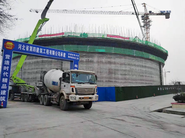 熟料儲存及輸送筒倉直徑60米,高20.5米。1月11日,業主項目負責人王利杰組織召開專題會議,鄭重要求1月20日前滑模施工必須完成。面對業主早日投產的殷切期盼,項目部緊急組織施工策劃,明確搶進度措施辦法,全體動員,多點發力,全力以赴?;J┕?。在動員會上,成立了以項目經理為組長的滑模領導小組,班子帶班,明確責任目標;與作業班組簽訂安全、質量承諾書,增強其責任意識;購置鋼筋間距測量設備,節省驗收鋼筋工程時間和人力。由于疫情原因,現場勞力不能迅速到位,項目部提前組織管理人員晚上加班吊運鋼筋、水泥、腳手板等材料,大家高漲的干勁兒在滑模現場起到了積極的帶動作用。庫壁預應力鋼絞線設置較為密集,每間隔26厘米一道,而且帶有柔性,往庫壁鋼筋內穿設時容易跑偏,工作效率低。為加快施工,技術人員巧妙地在庫壁鋼筋上加設了U型鋼筋固定鋼絞線穿行位置,然后大家一字排開,“一二、一二……”齊聲喊著口號,有節奏地用力將鋼絞線在庫壁鋼筋里穿行直到扶壁柱。數九隆冬的夜間滑模平臺上氣溫很低,但是大家的工作熱情不減,干勁不退,抬鋼筋、綁鋼筋、穿鋼絞線……,干得熱火朝天,沒有人叫苦喊累,在大家的共同努力下,滑模以每天2.7米的速度快速推進。