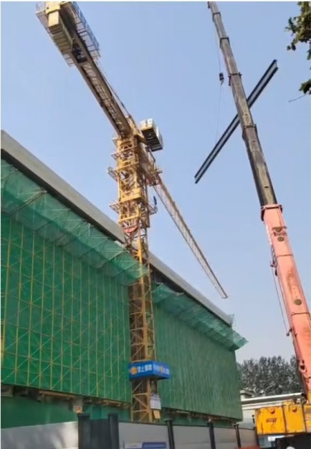 “大臂往右,慢一點……”塔吊下,信號工通過對講機指揮塔吊緩慢旋轉避讓。隨后,負重吊車精準、平穩(wěn)地將鋼梁吊裝到施工區(qū)。