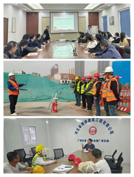 排查隱患,防患于未然。五分公司組織機關與項目部進行了全面深入的火災隱患大排查。機關重點針對辦公室、電動車棚、食堂和職工宿舍等區域展開細致排查,并及時整改發現的隱患。11月12日,廣陽項目部組織全體施工人員開展學習與消防演練活動,特別針對塔司、電梯司機、信號工等特殊工種作業人員進行了有針對性的培訓,結合施工現場實際情況詳細解讀消防法規的核心要點,深入剖析因電氣故障、明火使用不當等引發火災的典型案例,著重強調塔吊、施工升降機等設備運行區域及操作室的防火要點以及消防器材的正確配備、使用和日常維護方法。此外,因當地環保政策停工的藁城小學、定興糧庫項目,安排專人值守,定期加強對消防設施的日常檢查,并詳細記錄各類消防設施的狀態信息,如滅火器壓力是否正常等,確保停工期間消防設施的完好有效,將火災隱患扼殺在萌芽狀態。(五分公司)