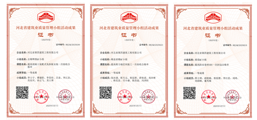 5月15日,七分公司申報的“提高防水卷材SBS一次封邊合格率”“提高剪力墻層間施工一次驗收合格率”“提高混凝土裝配式免拆板安裝一次驗收合格率”三項QC成果,被河北省建筑業(yè)協(xié)會評為“一等成果”。這不僅是河北省建筑業(yè)協(xié)會對分公司技術(shù)創(chuàng)新能力的高度認可,更是分公司扎實開展QC小組活動、有效攻克施工難題、提升項目施工質(zhì)量的生動寫照。